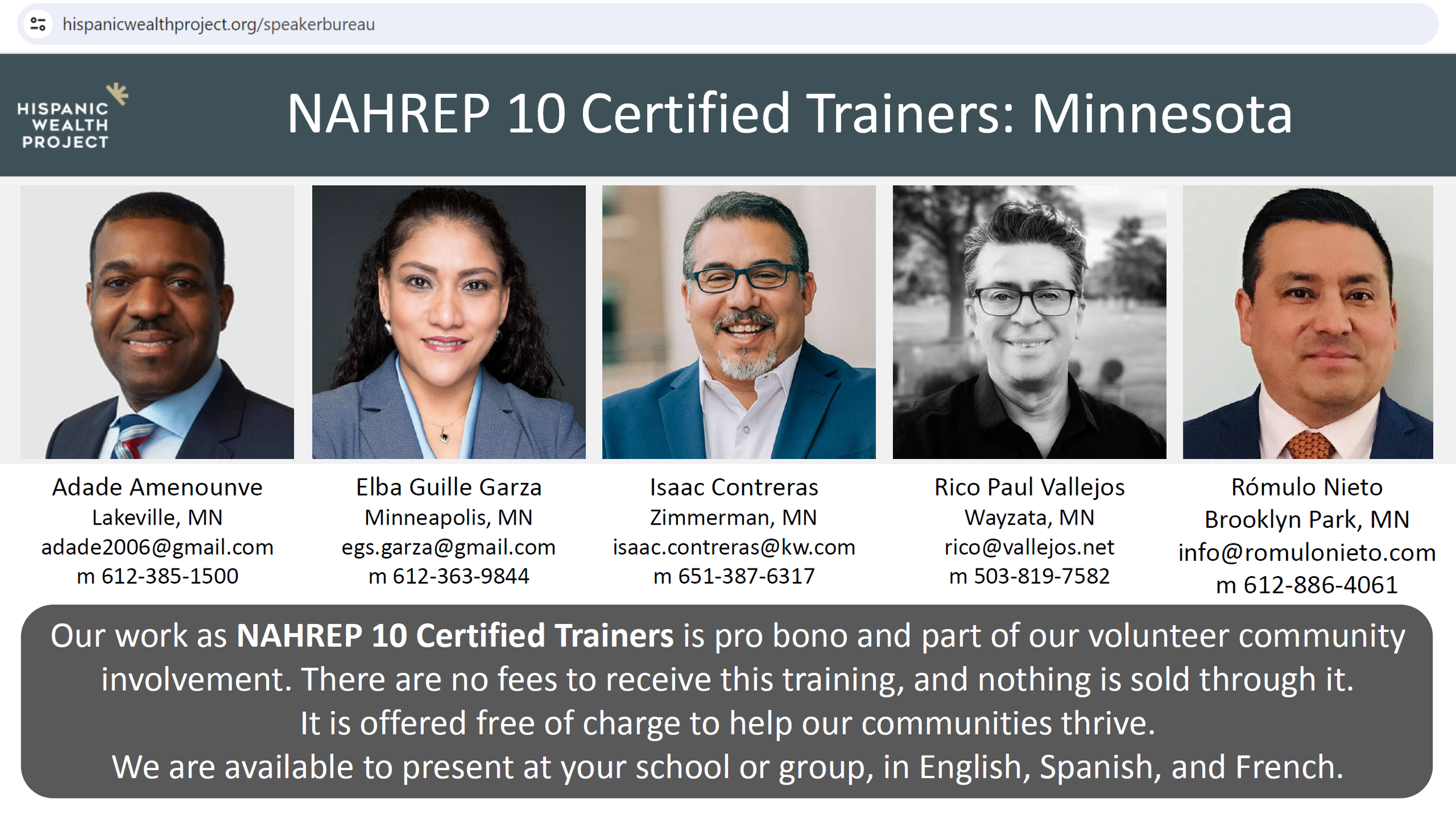 A growing number of NAHREP 10 Certified Trainers, as part of their pro bono contributions to their communities, play a critical role in educating Latino individuals and families across the country. Currently, there are five NAHREP 10 Certified Trainers in Minnesota. They are available to present the 10 disciplines in training sessions focusing on one or a few of the disciplines, in English, Spanish, or French, at your school, community organization, professional association, or church.
